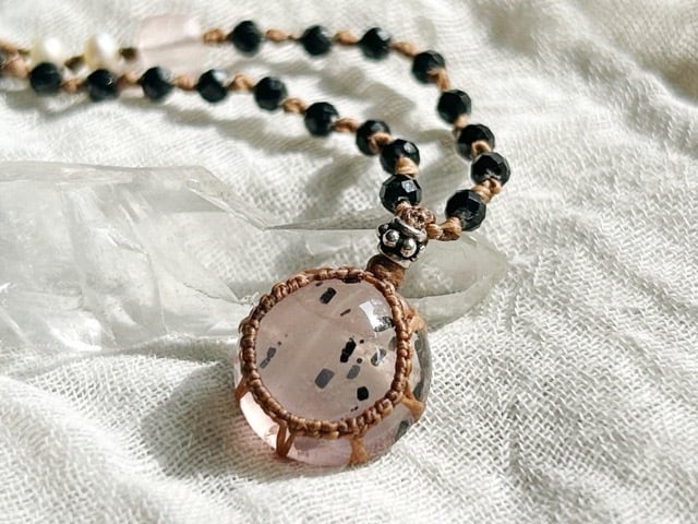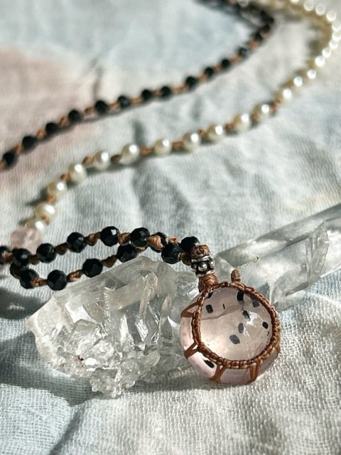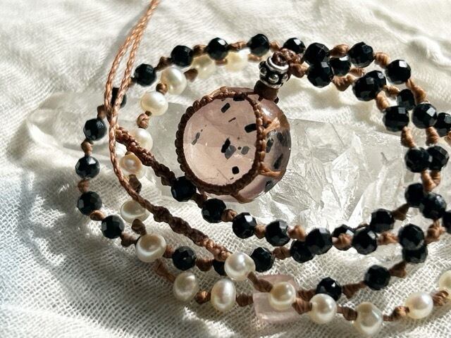 まるで肌に浸透してしまいそうな程に優しいピンクのローズクォーツですが、インクルージョンの黒に合わせてブラックスピネルのビーズを合わせてみました。優しい雰囲気も大切にしたくて、小さな淡水パールのビーズとスクエアカットのローズクォーツビーズも使用しました。
