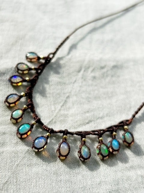 極細い紐で編み、連なる小さなオパールがレースの淵についているように、ゆらゆらと美しく揺れます。どの石もはっきりと色とりどりの遊色がみられます。
