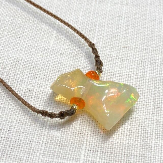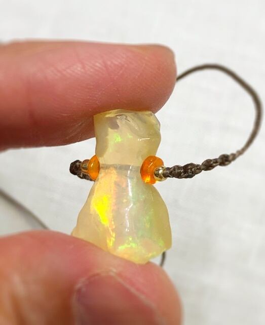 紐の部分にはエチオピアオパールビーズと、メキシコ産ファイヤーオパールビーズを使用しました。