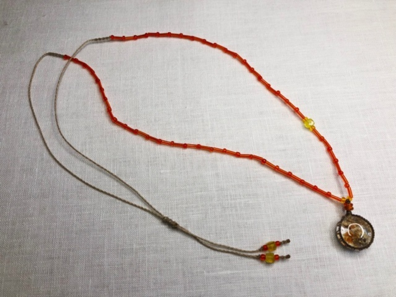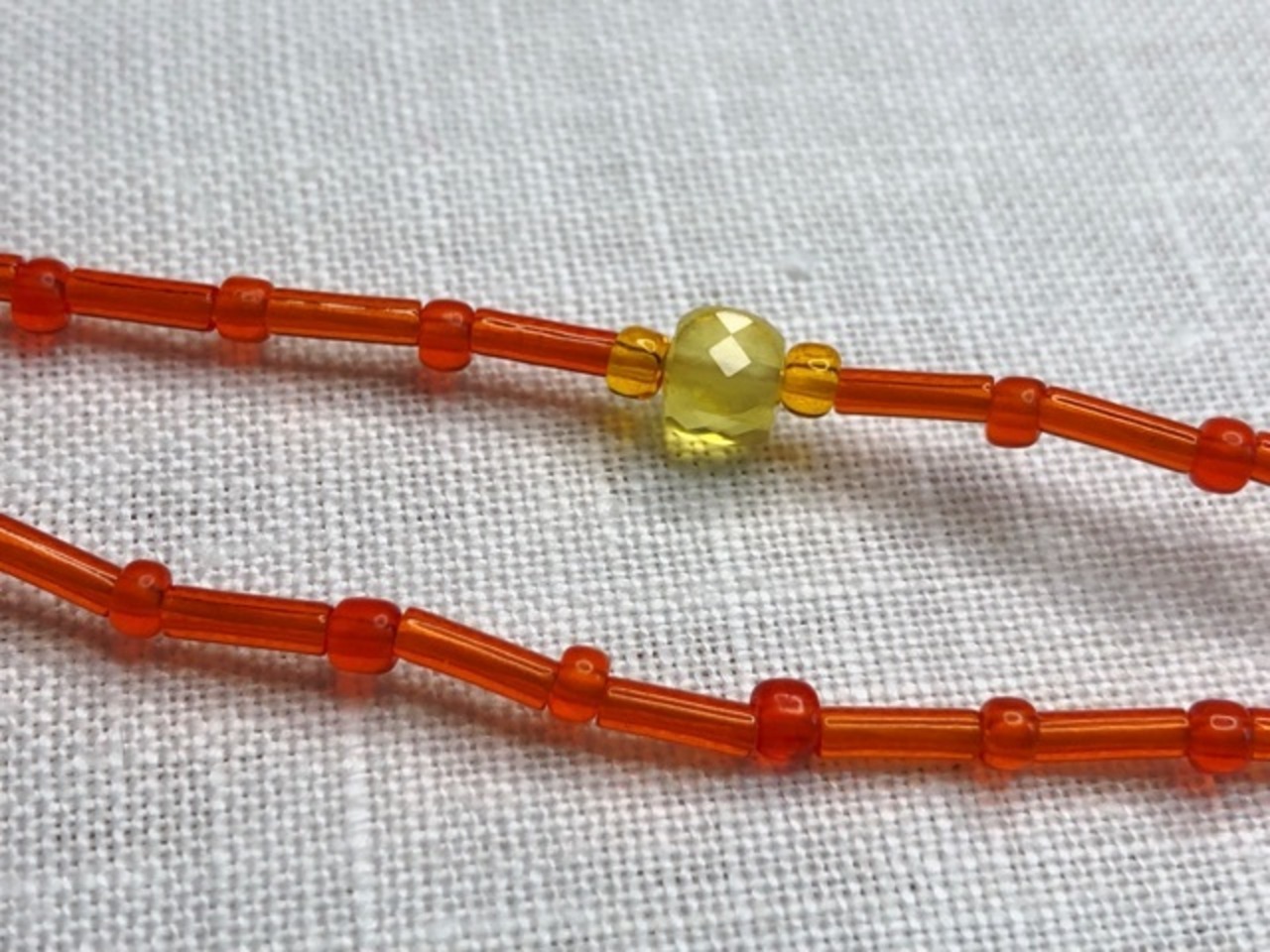 明るいオレンジ色の細長いビーズは竹ビーズと言います。懐かしいですね。